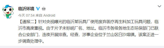 據(jù)山東臨沂環(huán)保局官方微博消息,針對央視曝光的臨沂某玩具廠使用廢棄醫(yī)療再生料加工玩具問題,臨沂市高度重視。由于片子未標明廠名、地址。臨沂市各級各地生態(tài)環(huán)保部門已聯(lián)合公安部門,連夜開展排查。經(jīng)查,涉事企業(yè)位于蘭山區(qū)白沙埠鎮(zhèn)。該案正進一步調(diào)查處理中。