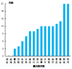 煙臺和威海市未出現(xiàn)重污染天氣;重污染天數(shù)最多的是聊城和菏澤市,為21天。16市同比減少,減少天數(shù)最多的是德州市,為17天;威海市同比持平。