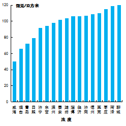 可吸入顆粒物濃度最好的是威海市,為50μg/m3,最差的是聊城市,為120μg/m3。17市均同比下降,下降幅度最大的是濟南市,為13.7%。