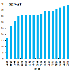 細(xì)顆粒物濃度最好的是威海市,為25μg/m3,最差的是聊城市,為60μg/m3。17市均同比下降,下降幅度最大的是菏澤市,為18.3%。