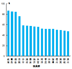優(yōu)良率最好的是威海市,為87.1%,最差的是濱州市,為47.5%。8市同比增加,增加幅度最大的是菏澤市,為7.2個百分點;9市同比減少,減少幅度最大的是萊蕪和濱州市,為3.9個百分點。