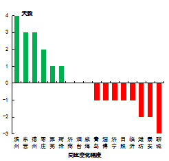 東營(yíng)等4市未出現(xiàn)重污染天氣;重污染天數(shù)最多的是聊城市,為7天。6市同比減少,減少天數(shù)最多的是濱州市,為4天;3市同比持平;8市同比增加,增加天數(shù)最多的是聊城市,為3天。