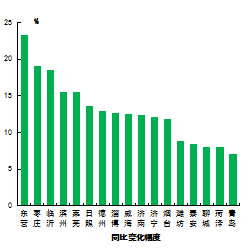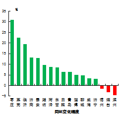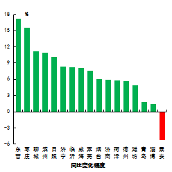 二氧化硫濃度最好的是威海市,為8μg/m3,最差的是淄博市,為32μg/m3。15市同比下降,下降幅度最大的是棗莊市,為56.4%;聊城市同比持平;德州市同比上升,上升幅度為8.0%。