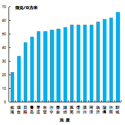 可吸入顆粒物濃度最好的是威海市,為57μg/m3,最差的是菏澤市,為179μg/m3。16市同比下降,下降幅度最大的是東營(yíng)市,為17.2%;泰安市同比上升,上升幅度為5.3%。
