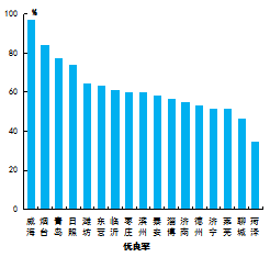 綜合指數(shù)最好的縣(市、區(qū))是威海市威海經(jīng)濟(jì)技術(shù)開(kāi)發(fā)區(qū),為2.88;最差的縣(市、區(qū))是莘縣,為9.10。