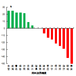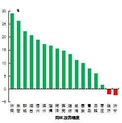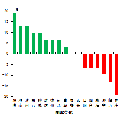 環(huán)境空氣質量綜合指數(shù)最好的城市是威海市,為2.62;最差的城市是棗莊市,為6.63。6市同比下降,下降幅度最大的城市是東營和煙臺市,為7.5%;11市同比上升,上升幅度最大的城市是棗莊市,上升幅度為16.7%。