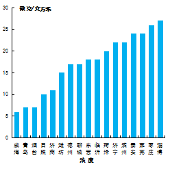 排名后20位(第164位至第145位)的縣(市、區(qū))依次為:棗莊市市中區(qū),鄆城縣,棗莊市臺兒莊區(qū),淄博市臨淄區(qū),萊蕪市鋼城區(qū)、棗莊市高新區(qū)(并列第159位),鄄城縣,冠縣,棗莊市嶧城區(qū),泰安市高新區(qū),淄博市張店區(qū),成武縣,巨野縣,單縣,淄博市周村區(qū),濟南市天橋區(qū),曹縣,淄博市高新區(qū),菏澤市牡丹區(qū)、濱州市開發(fā)區(qū)、萊蕪市經(jīng)濟開發(fā)區(qū)(并列第144位)。