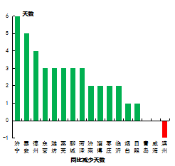 重污染天數(shù)最少的城市是濟(jì)南等16市,未出現(xiàn)重污染天氣;最多的的城市是濱州市,為4天。14市同比減少,減少幅度最大的城市是濟(jì)寧市,為6天;青島和威海市同比持平;濱州市同比增加,增加天數(shù)為1天。