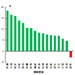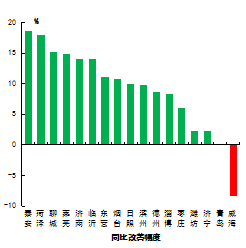 環(huán)境空氣質(zhì)量綜合指數(shù)最好的是威海市,為3.35,最差的是淄博市,為5.63。16市同比下降,下降幅度最大的是泰安市,為18.4%;威海市同比上升,上升幅度為2.8%。