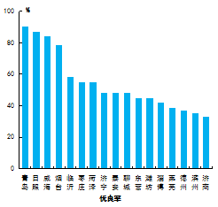 優(yōu)良率最好的是青島市,為90.3%,最差的是濟(jì)南市,為33.3%。16市同比增加,增加幅度最大的是泰安市,為37.3個(gè)百分點(diǎn);萊蕪市同比減少,減少幅度為17.3個(gè)百分點(diǎn)。