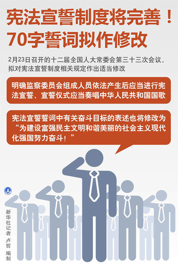 23日召開的十二屆全國人大常委會第三十三次會議,擬對憲法宣誓制度相關(guān)規(guī)定作出適當(dāng)修改,明確監(jiān)察委員會組成人員依法產(chǎn)生后應(yīng)當(dāng)進行憲法宣誓、宣誓儀式應(yīng)當(dāng)奏唱中華人民共和國國歌。憲法宣誓誓詞中有關(guān)奮斗目標的表述也將修改為“為建設(shè)富強民主文明和諧美麗的社會主義現(xiàn)代化強國努力奮斗!”