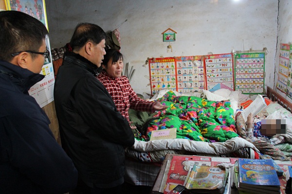 在貧困戶張恒芳家中,王安德詳細詢問其家庭情況及面臨的困難。張恒芳是一名共產(chǎn)黨員,參加過汶川地震的救災(zāi)行動,其兒子現(xiàn)在8歲,患有成骨發(fā)育不全(瓷娃娃)和顱骨發(fā)育畸形,極易骨折,需常年吃藥、定期復(fù)查,并需要寸步不離的照顧;女兒19歲,讀高三,成績優(yōu)異,但為了替父母分擔(dān)壓力,利用寒暑假外出打工,不幸失神發(fā)作,需長期服藥控制,兩個孩子巨額的醫(yī)療費用使得家庭十分困難。為了幫助該家庭渡過難關(guān),省環(huán)保廳第一書記工作組前期走訪時為其捐款5000元。王安德鼓勵張恒芳和妻子堅定信心,克服困難,保持積極向上的生活態(tài)度,照顧好兩個孩子,第一書記要利用好各種幫扶政策對該家庭進行全力幫助,重點是找一個既能照顧孩子又能在家里干的活,增加一點固定收入,環(huán)保廳工作組將給予其重點幫扶。