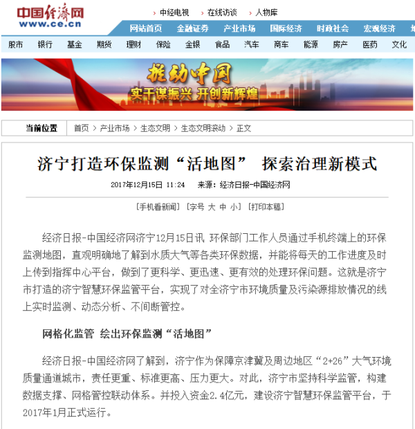 環(huán)保部門工作人員通過手機終端上的環(huán)保監(jiān)測地圖,直觀明確地了解到水質(zhì)大氣等各類環(huán)保數(shù)據(jù),并能將每天的工作進度及時上傳到指揮中心平臺,做到了更科學、更迅速、更有效的處理環(huán)保問題。這就是濟寧市打造的濟寧智慧環(huán)保監(jiān)管平臺。中國經(jīng)濟網(wǎng)以《濟寧打造環(huán)保監(jiān)測“活地圖” 探索治理新模式》為題,報道了濟寧在網(wǎng)格化監(jiān)管方面的經(jīng)驗、成效,通過探索治理新模式,科學治理、精準施策,實現(xiàn)了經(jīng)濟增長、生態(tài)改善、民生福祉互促共贏的良好局面。