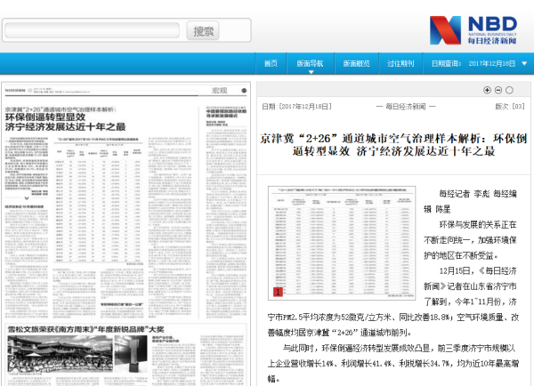 每日經(jīng)濟新聞則以《京津冀“2+26”通道城市空氣治理樣本解析:環(huán)保倒逼轉(zhuǎn)型顯效 濟寧經(jīng)濟發(fā)展達近十年之最》為題,報道了“環(huán)保與發(fā)展的關系正在不斷走向統(tǒng)一,加強環(huán)境保護的地區(qū)在不斷受益”的濟寧樣本:今年1~11月份,濟寧市PM2.5平均濃度為52微克/立方米、同比改善18.8%;空氣環(huán)境質(zhì)量、改善幅度均居京津冀“2+26”通道城市前列。與此同時,環(huán)保倒逼經(jīng)濟轉(zhuǎn)型發(fā)展成效凸顯,前三季度濟寧市規(guī)模以上企業(yè)營收增長14%、利潤增長41.4%、利稅增長34.7%,均為近10年最高增幅。